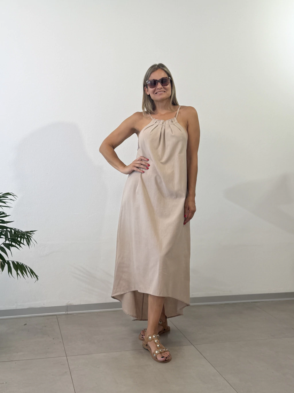 Luce fresca, libre y naturalmente elegante con este vestido de lino en tono nude claro. Diseñado para esos días en los que buscás comodidad sin renunciar al estilo, este modelo de corte relajado y caída fluida se convertirá en tu nuevo favorito del verano.